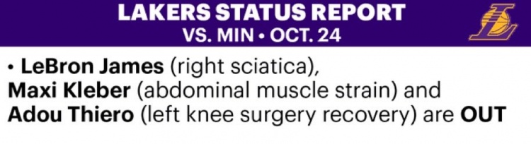2025-10-24 09:46:14明日战森林狼!湖人伤病报告:詹姆斯 克莱伯 蒂耶罗继续缺阵