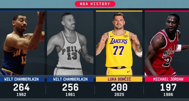 2025-11-06 16:12:26东契奇开赛季5场比赛砍200分 历史第三高&前二都是张伯伦