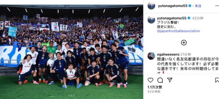 2025-10-15 00:00:53Bravo!长友佑都社媒庆祝:击败巴西队!今日将载入史册